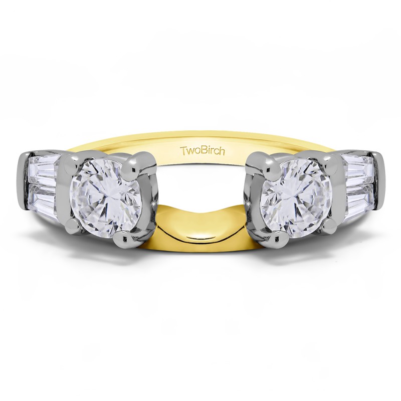 This ring wrap has 6 stones in total. It features a mix of round and baguette prong set stones with a total combined weight of 1 carats. It has a total width of 2 millimeters. Tapered baguettes in this wrap are set with bars, and lead the eye to the prong set round stone on each side of the center. This ring wrap is made to fit a round solitaire from 0.5 carat up to 1.5 carat, or a marquise solitaire from 0.25 carat up to 0.5 carat, or a princess solitaire from 0.5 carat up to 1 carat.