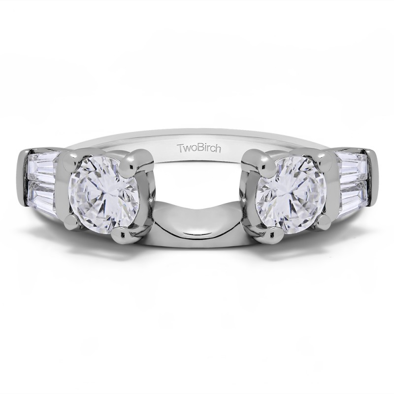 This ring wrap has 6 stones in total. It features a mix of round and baguette prong set stones with a total combined weight of 1 carats. It has a total width of 2 millimeters. Tapered baguettes in this wrap are set with bars, and lead the eye to the prong set round stone on each side of the center. This ring wrap is made to fit a round solitaire from 0.5 carat up to 1.5 carat, or a marquise solitaire from 0.25 carat up to 0.5 carat, or a princess solitaire from 0.5 carat up to 1 carat.