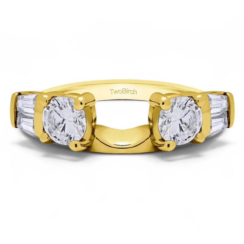 This ring wrap has 6 stones in total. It features a mix of round and baguette prong set stones with a total combined weight of 1 carats. It has a total width of 2 millimeters. Tapered baguettes in this wrap are set with bars, and lead the eye to the prong set round stone on each side of the center. This ring wrap is made to fit a round solitaire from 0.5 carat up to 1.5 carat, or a marquise solitaire from 0.25 carat up to 0.5 carat, or a princess solitaire from 0.5 carat up to 1 carat.