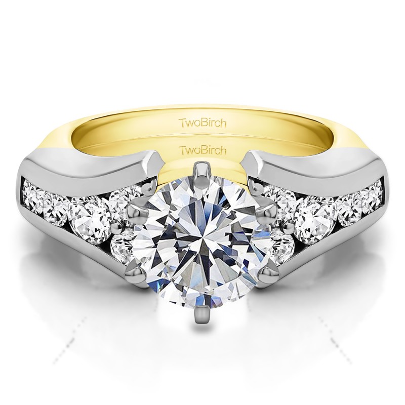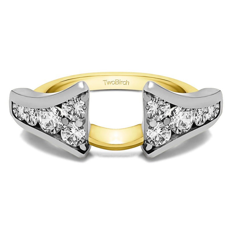 This ring wrap has 10 round, channel set stones with a total combined weight of 1 carats. It has a total width of 2.1 millimeters and has a unique Y shape with stones that lead up to the center. This ring wrap is made to fit a round solitaire from 0.75 carat up to 2 carat, or a marquise solitaire from 0.25 carat up to 0.5 carat, or a princess solitaire from 0.75 carat up to 2 carat.