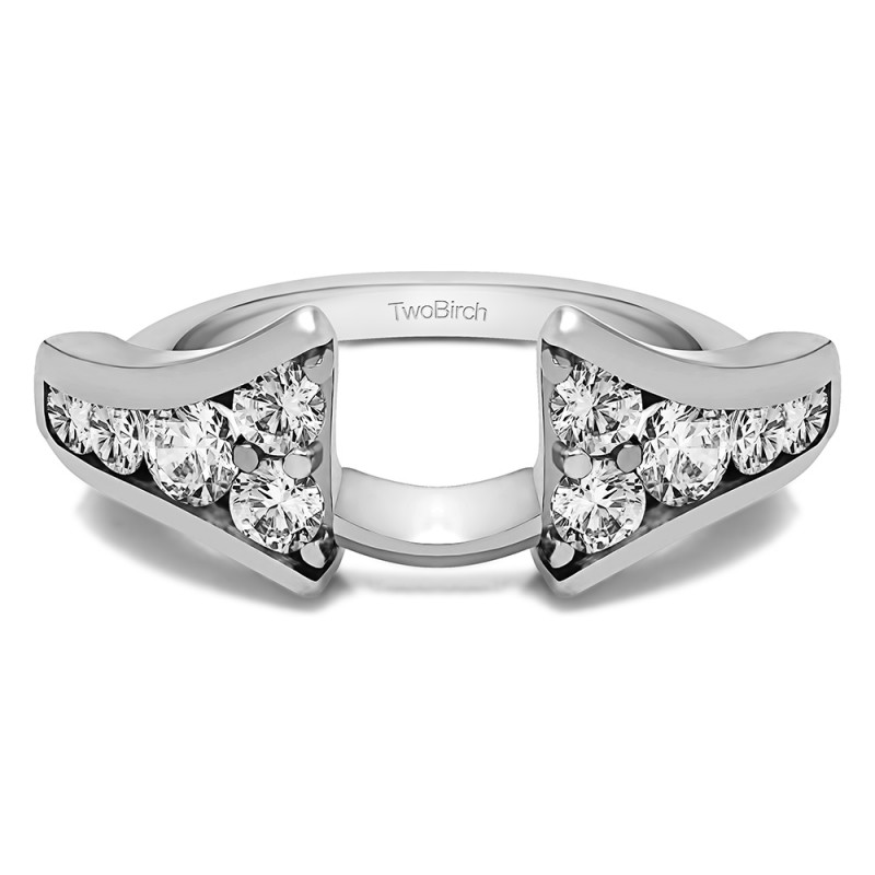This ring wrap has 10 round, channel set stones with a total combined weight of 1 carats. It has a total width of 2.1 millimeters and has a unique Y shape with stones that lead up to the center. This ring wrap is made to fit a round solitaire from 0.75 carat up to 2 carat, or a marquise solitaire from 0.25 carat up to 0.5 carat, or a princess solitaire from 0.75 carat up to 2 carat.