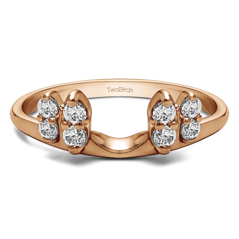 This ring wrap has 8 round, prong set stones with a total combined weight of 0.24 carats. It has a total width of 1.8 millimeters and has marquise shaped adornments set with prong set round stones. This ring wrap is made to fit a round solitaire from 0.5 carat up to 2 carat, or a marquise solitaire from 0.25 carat up to 0.5 carat, or a princess solitaire from 0.5 carat up to 1 carat.