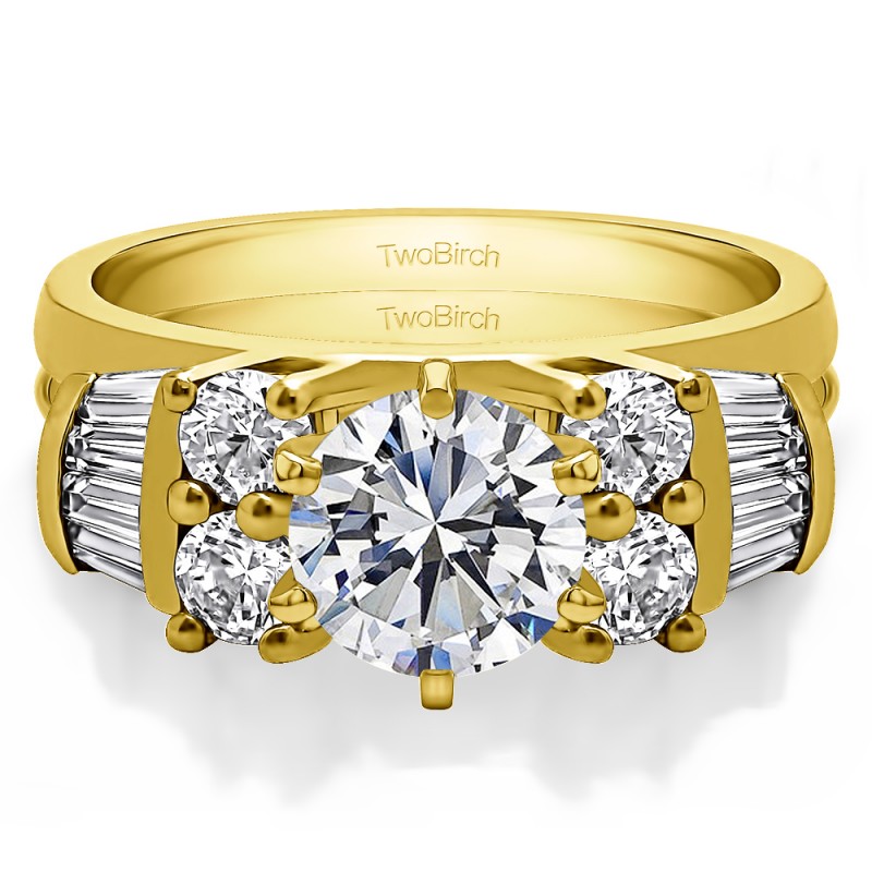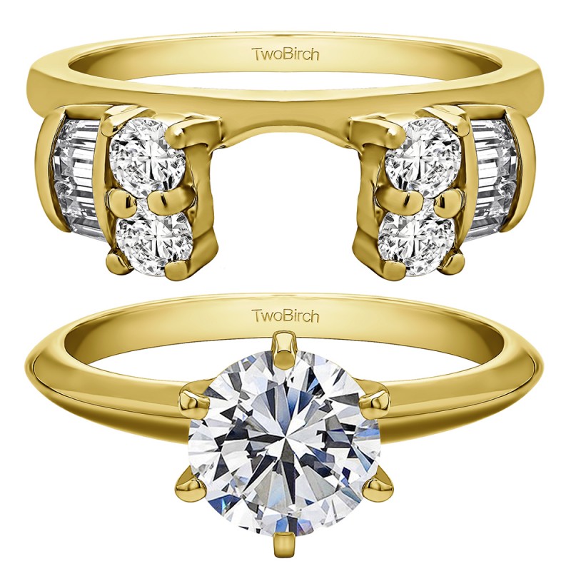 This ring wrap has 12 stones in total. It features a mix of round and baguette prong set stones with a total combined weight of 0.48 carats. It has a total width of 2 millimeters and has a mix of baguettes and round with a high polish finish. This ring wrap is made to fit a round solitaire from 0.75 carat up to 1 carat, or a marquise solitaire from 0.25 carat up to 0.5 carat, or a princess solitaire from 0.75 carat up to 1 carat.