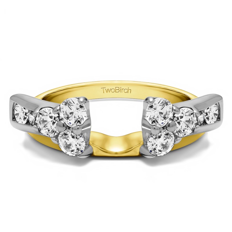 This ring wrap has 10 stones in total. It features a mix of round and round prong set stones with a total combined weight of 0.5 carats. It has a total width of 2.1 millimeters and features a prong set cluster accented with round channel set stones. This ring wrap is made to fit a round solitaire from 0.5 carat up to 0.75 carat, or a marquise solitaire from 0.25 carat up to 0.5 carat, or a princess solitaire from 0.5 carat up to 0.75 carat.