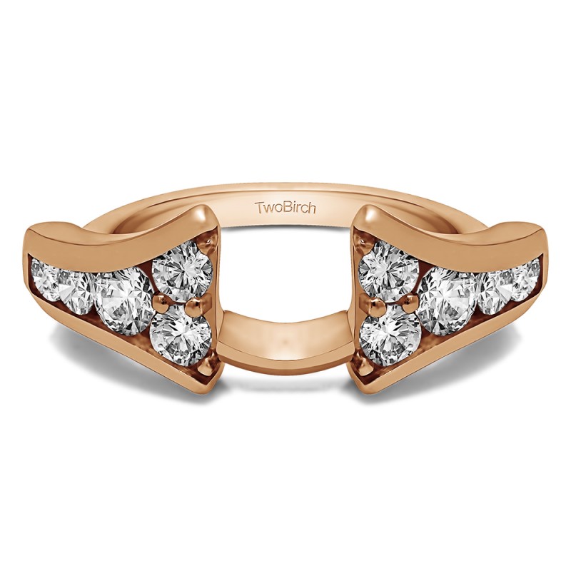 This ring wrap has 10 round, channel set stones with a total combined weight of 0.5 carats. It has a total width of 2.2 millimeters and has a unique Y shape with stones that lead up to the center. This ring wrap is made to fit a round solitaire from 0.75 carat up to 2 carat, or a marquise solitaire from 0.25 carat up to 0.5 carat, or a princess solitaire from 0.75 carat up to 2 carat.