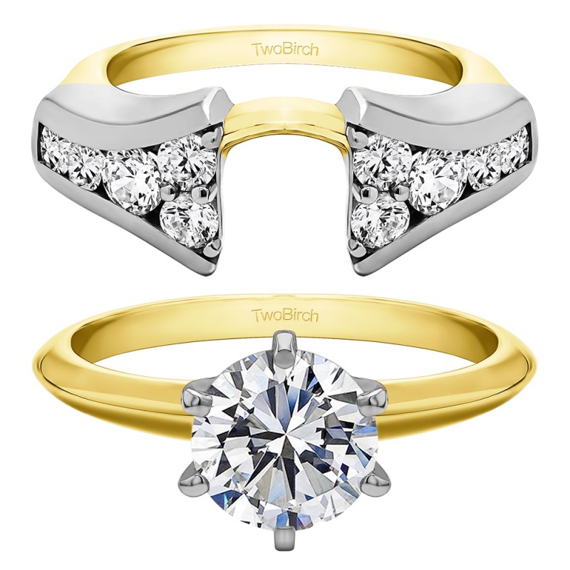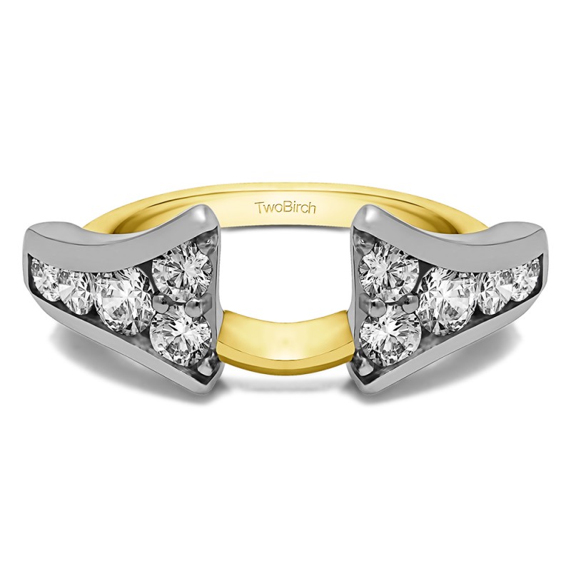 This ring wrap has 10 round, channel set stones with a total combined weight of 0.5 carats. It has a total width of 2.2 millimeters and has a unique Y shape with stones that lead up to the center. This ring wrap is made to fit a round solitaire from 0.75 carat up to 2 carat, or a marquise solitaire from 0.25 carat up to 0.5 carat, or a princess solitaire from 0.75 carat up to 2 carat.