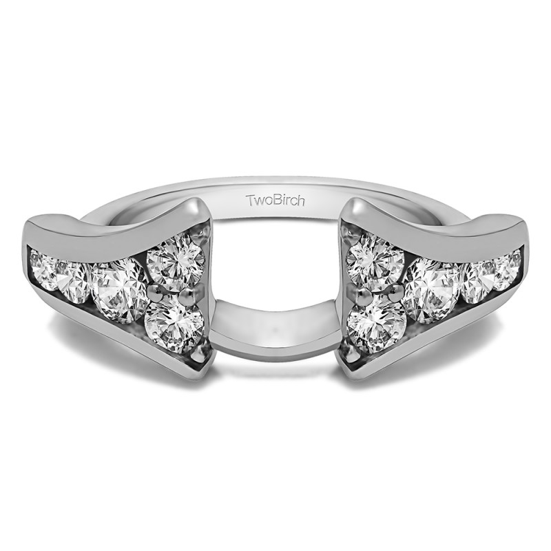 This ring wrap has 10 round, channel set stones with a total combined weight of 0.5 carats. It has a total width of 2.2 millimeters and has a unique Y shape with stones that lead up to the center. This ring wrap is made to fit a round solitaire from 0.75 carat up to 2 carat, or a marquise solitaire from 0.25 carat up to 0.5 carat, or a princess solitaire from 0.75 carat up to 2 carat.