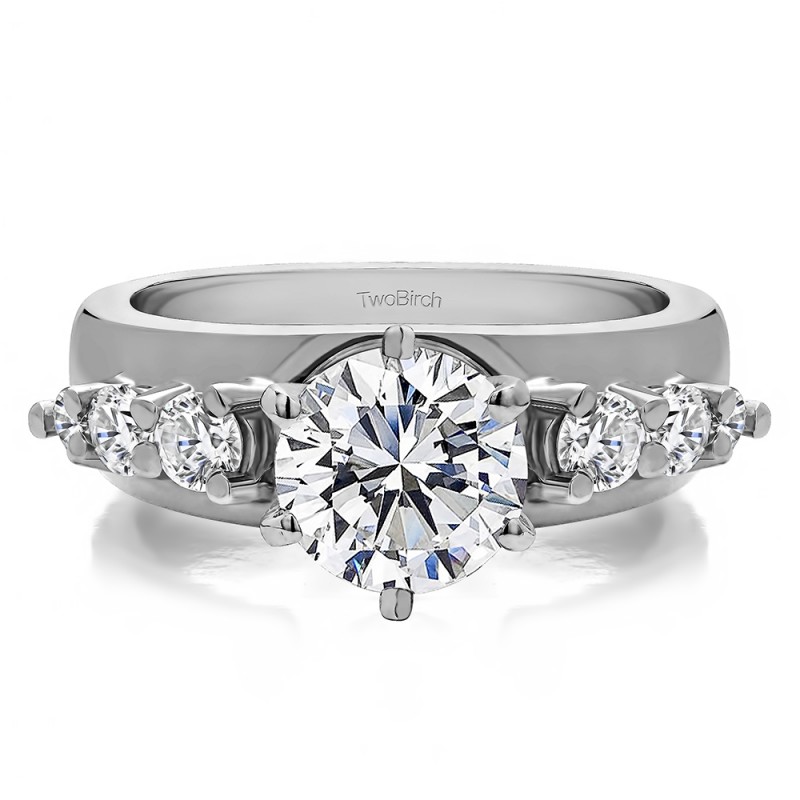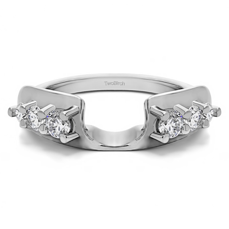 This ring wrap has 6 round, prong set stones with a total combined weight of 0.5 carats. It has a total width of 1.8 millimeters. The stones in the ring wrap jacket are graduated in size. This ring wrap is made to fit a round solitaire from 0.75 carat up to 2 carat, or a marquise solitaire from 0.25 carat up to 0.5 carat, or a princess solitaire from 0.75 carat up to 1 carat.