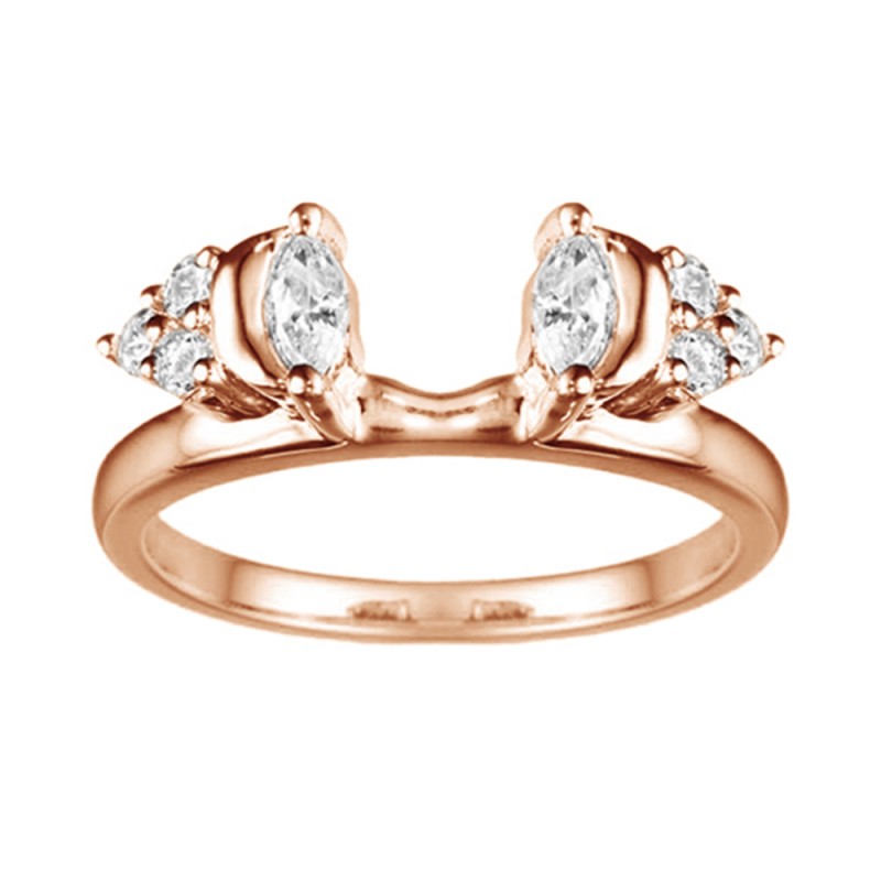 This ring wrap has 8 stones in total. It features a mix of round and marquise prong set stones with a total combined weight of 0.5 carats. It has a total width of 2 millimeters. The marquise being set in a stunning curved channel give the illusion of a half-moon on each side the of the center. This ring wrap is made to fit a round solitaire from 0.5 carat up to 2 carat, or a marquise solitaire from 0.25 carat up to 0.5 carat, or a princess solitaire from 0.5 carat up to 1 carat.