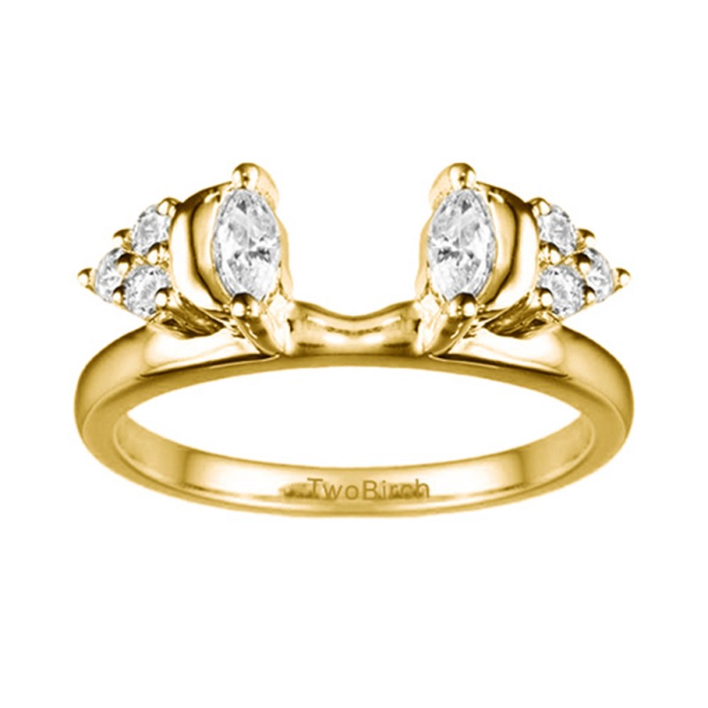 This ring wrap has 8 stones in total. It features a mix of round and marquise prong set stones with a total combined weight of 0.5 carats. It has a total width of 2 millimeters. The marquise being set in a stunning curved channel give the illusion of a half-moon on each side the of the center. This ring wrap is made to fit a round solitaire from 0.5 carat up to 2 carat, or a marquise solitaire from 0.25 carat up to 0.5 carat, or a princess solitaire from 0.5 carat up to 1 carat.