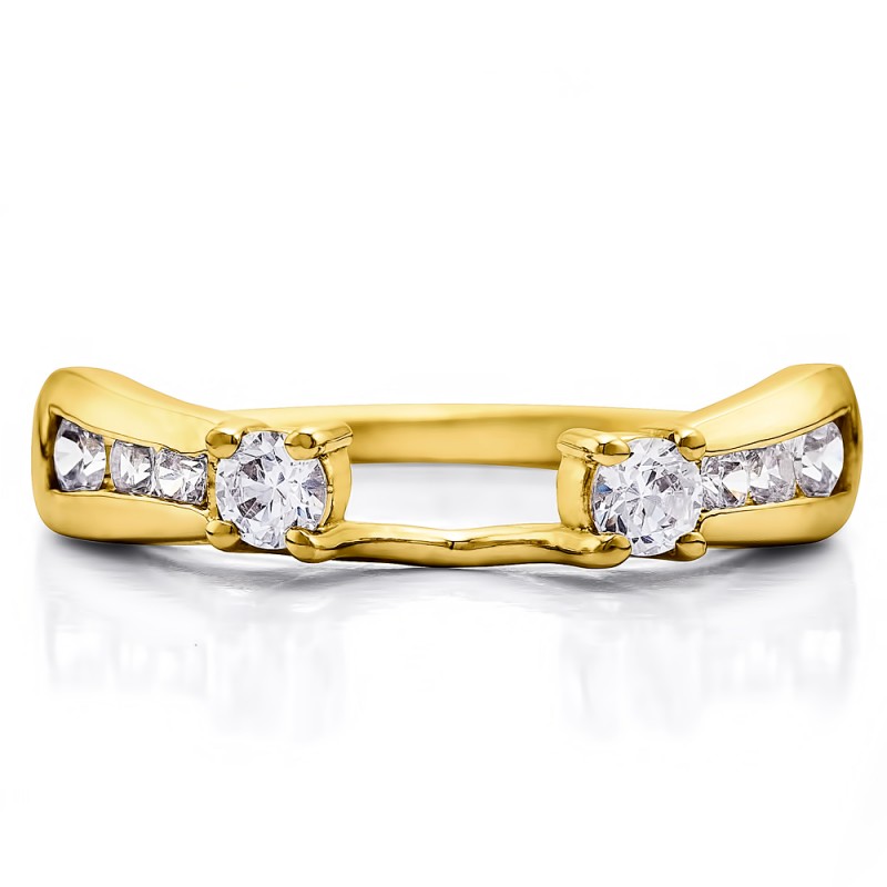 This ring wrap has 8 stones in total. It features a mix of round and round prong set stones with a total combined weight of 0.5 carats. It has a total width of 1.8 millimeters and features a classic high polish finish. This ring wrap is made to fit a round solitaire from 0.5 carat up to 0.75 carat, or a marquise solitaire from 0.25 carat up to 0.5 carat, or a princess solitaire from 0.5 carat up to 1 carat.