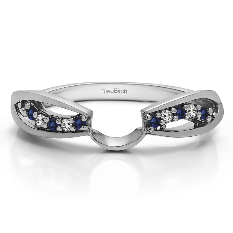 This ring wrap has 10 round, prong set stones with a total combined weight of 0.1 carats. It has a total width of 2 millimeters and features a swirl design with a cut out, finished off with a high polish. This ring wrap is made to fit a round solitaire from 0.3 carat up to 1 carat, or a marquise solitaire from 0.25 carat up to 0.5 carat, or a princess solitaire from 0.5 carat up to 1 carat.