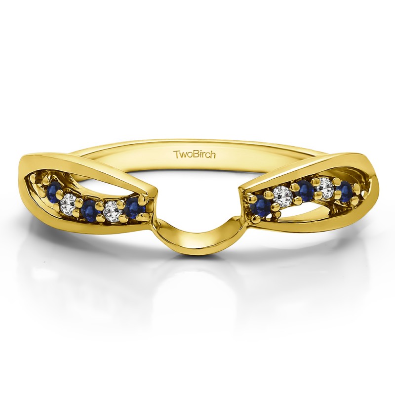 This ring wrap has 10 round, prong set stones with a total combined weight of 0.1 carats. It has a total width of 2 millimeters and features a swirl design with a cut out, finished off with a high polish. This ring wrap is made to fit a round solitaire from 0.3 carat up to 1 carat, or a marquise solitaire from 0.25 carat up to 0.5 carat, or a princess solitaire from 0.5 carat up to 1 carat.