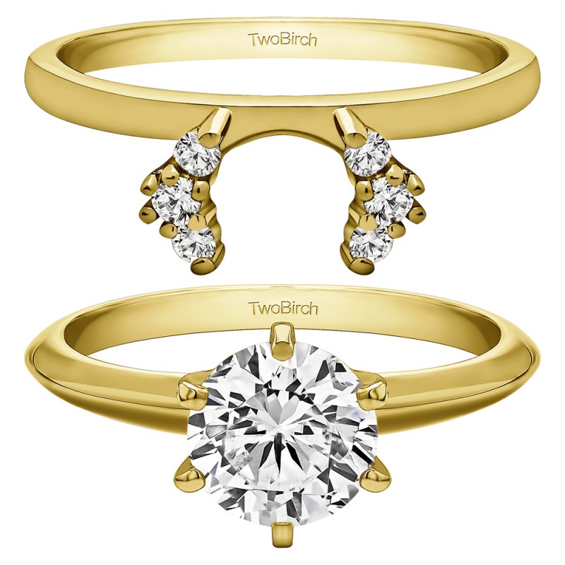 This ring wrap has 6 round, prong set stones with a total combined weight of 0.13 carats. It has a total width of 1.9 millimeters and has three stones on each side of the center that create the look of a halo engagement ring once you add your solitaire. This ring wrap is made to fit a round solitaire from 0.25 carat up to 0.75 carat, or a marquise solitaire from 0.25 carat up to 0.5 carat, or a princess solitaire from 0.5 carat up to 0.75 carat.