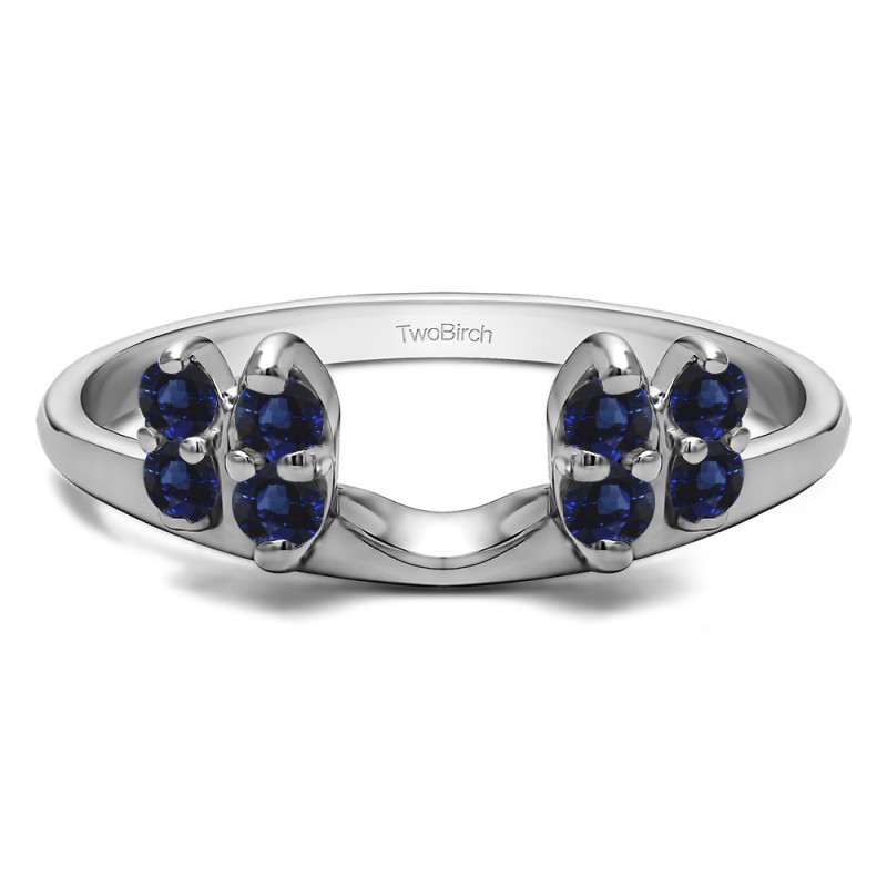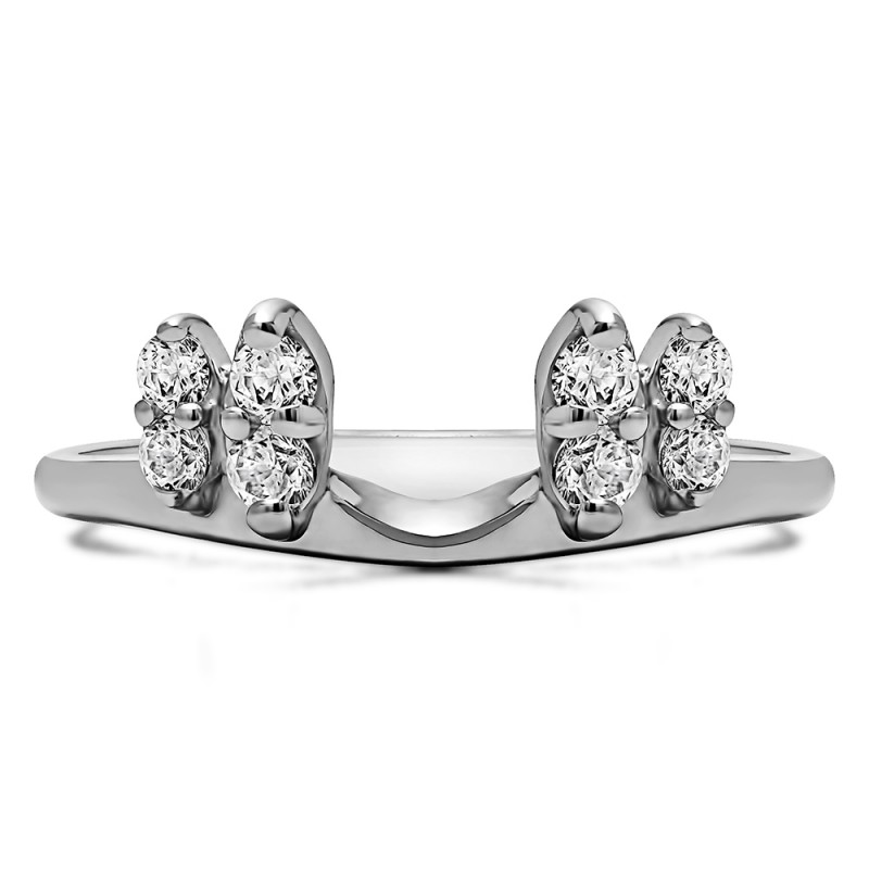 This ring wrap has 8 round, prong set stones with a total combined weight of 0.16 carats. It has a total width of 1.7 millimeters and has marquise shaped adornments set with prong set round stones. This ring wrap is made to fit a round solitaire from 0.25 carat up to 0.5 carat, or a marquise solitaire from 0.25 carat up to 0.5 carat, or a princess solitaire from 0.5 carat up to 0.75 carat.
