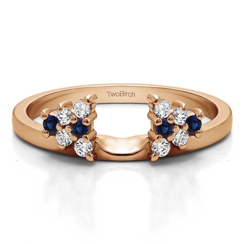 This ring wrap has 12 round, prong set stones with a total combined weight of 0.23 carats. It has a total width of 2 millimeters. The clusters in this ring wrap are shaped like a triangle. This ring wrap is made to fit a round solitaire from 0.5 carat up to 1.5 carat, or a marquise solitaire from 0.25 carat up to 0.5 carat, or a princess solitaire from 0.5 carat up to 1 carat.