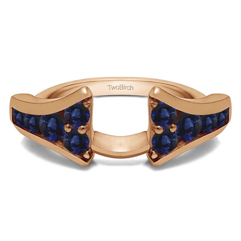 This ring wrap has 10 round, channel set stones with a total combined weight of 0.25 carats. It has a total width of 2 millimeters and has a unique Y shape with stones that lead up to the center. This ring wrap is made to fit a round solitaire from 0.75 carat up to 1.5 carat, or a marquise solitaire from 0.25 carat up to 0.5 carat, or a princess solitaire from 0.75 carat up to 1.5 carat.