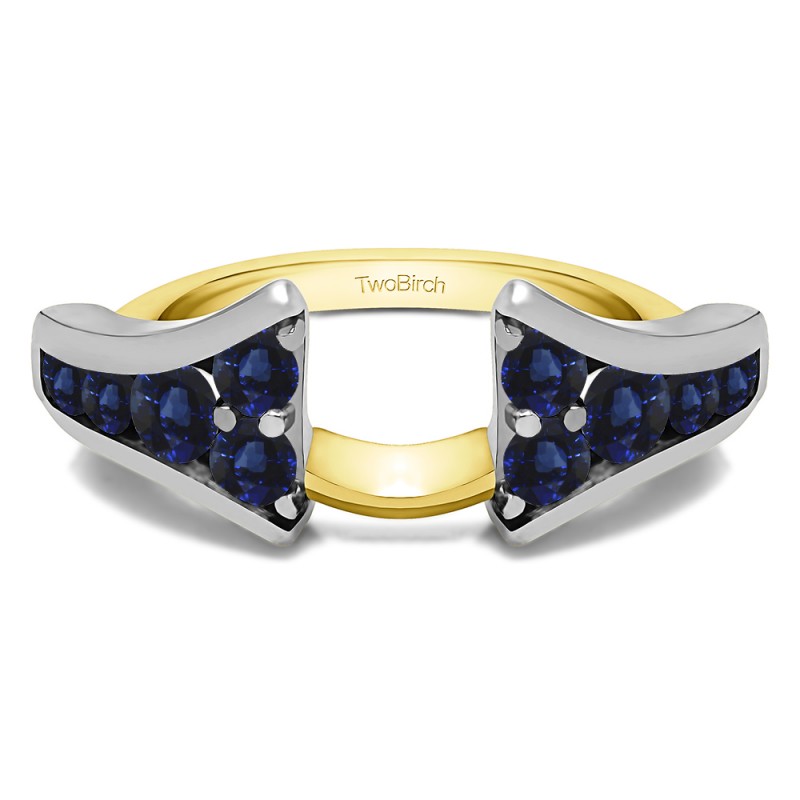 This ring wrap has 10 round, channel set stones with a total combined weight of 0.25 carats. It has a total width of 2 millimeters and has a unique Y shape with stones that lead up to the center. This ring wrap is made to fit a round solitaire from 0.75 carat up to 1.5 carat, or a marquise solitaire from 0.25 carat up to 0.5 carat, or a princess solitaire from 0.75 carat up to 1.5 carat.
