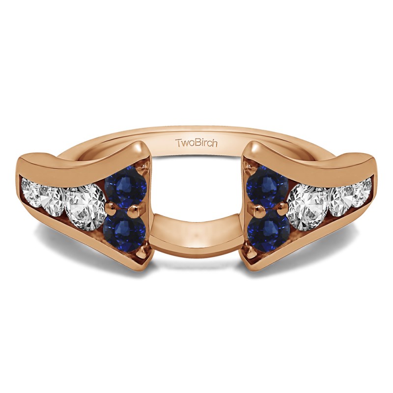 This ring wrap has 10 round, channel set stones with a total combined weight of 0.25 carats. It has a total width of 2 millimeters and has a unique Y shape with stones that lead up to the center. This ring wrap is made to fit a round solitaire from 0.75 carat up to 1.5 carat, or a marquise solitaire from 0.25 carat up to 0.5 carat, or a princess solitaire from 0.75 carat up to 1.5 carat.