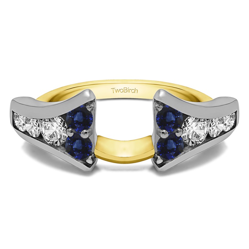 This ring wrap has 10 round, channel set stones with a total combined weight of 0.25 carats. It has a total width of 2 millimeters and has a unique Y shape with stones that lead up to the center. This ring wrap is made to fit a round solitaire from 0.75 carat up to 1.5 carat, or a marquise solitaire from 0.25 carat up to 0.5 carat, or a princess solitaire from 0.75 carat up to 1.5 carat.