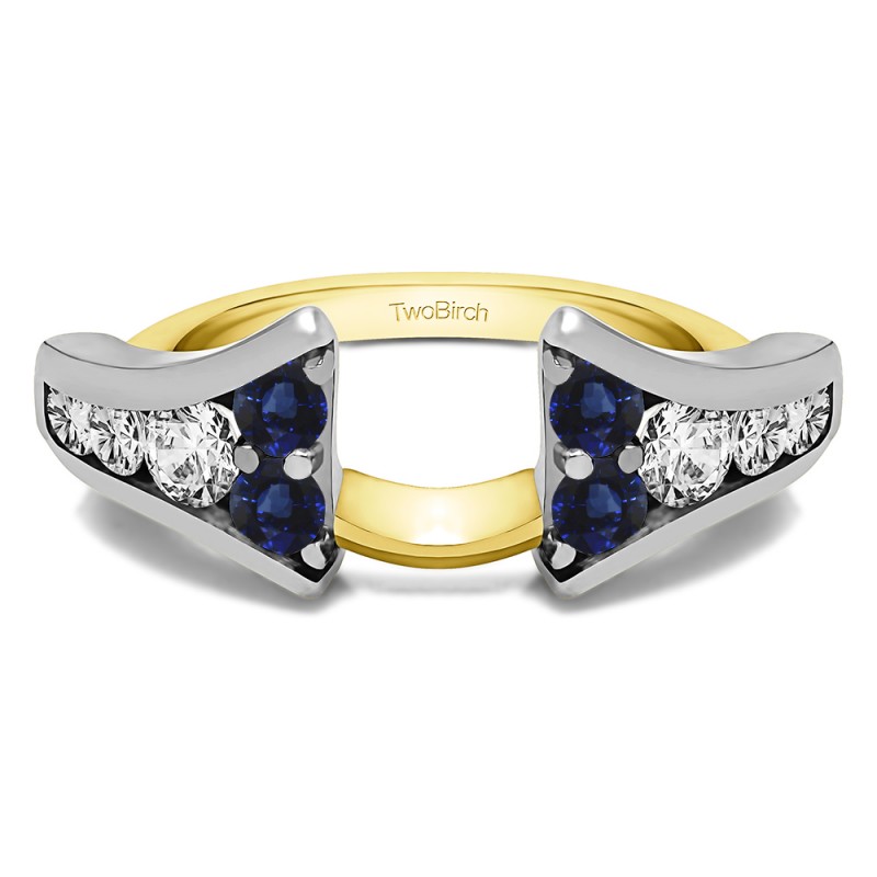 This ring wrap has 10 round, channel set stones with a total combined weight of 0.25 carats. It has a total width of 2 millimeters and has a unique Y shape with stones that lead up to the center. This ring wrap is made to fit a round solitaire from 0.75 carat up to 1.5 carat, or a marquise solitaire from 0.25 carat up to 0.5 carat, or a princess solitaire from 0.75 carat up to 1.5 carat.
