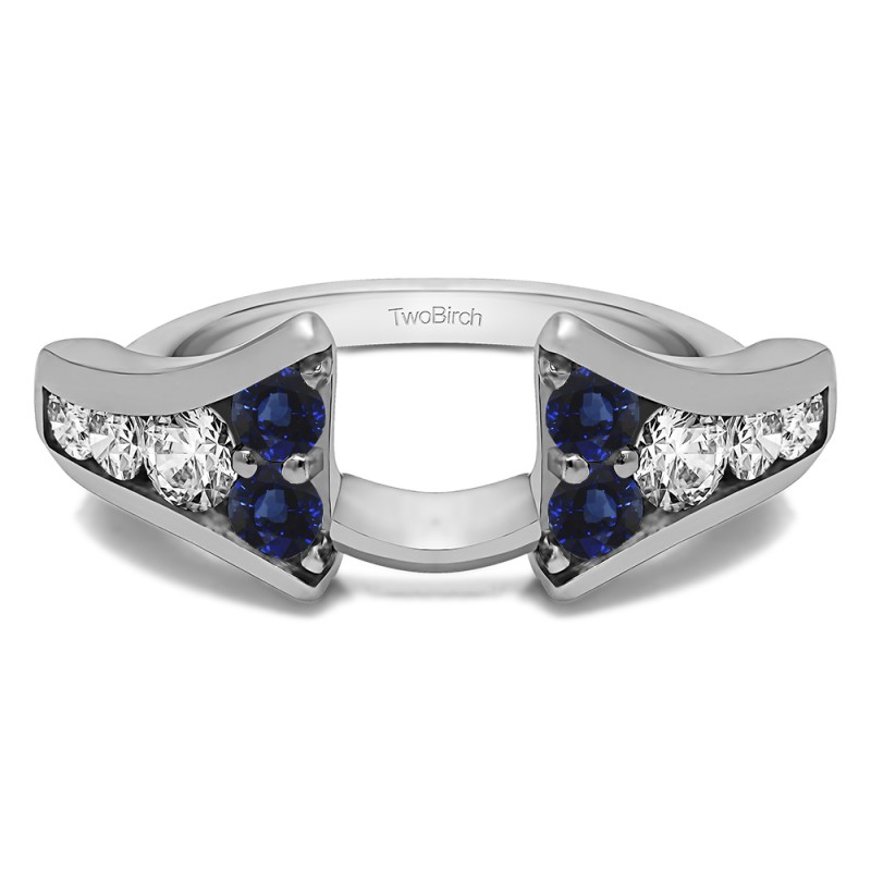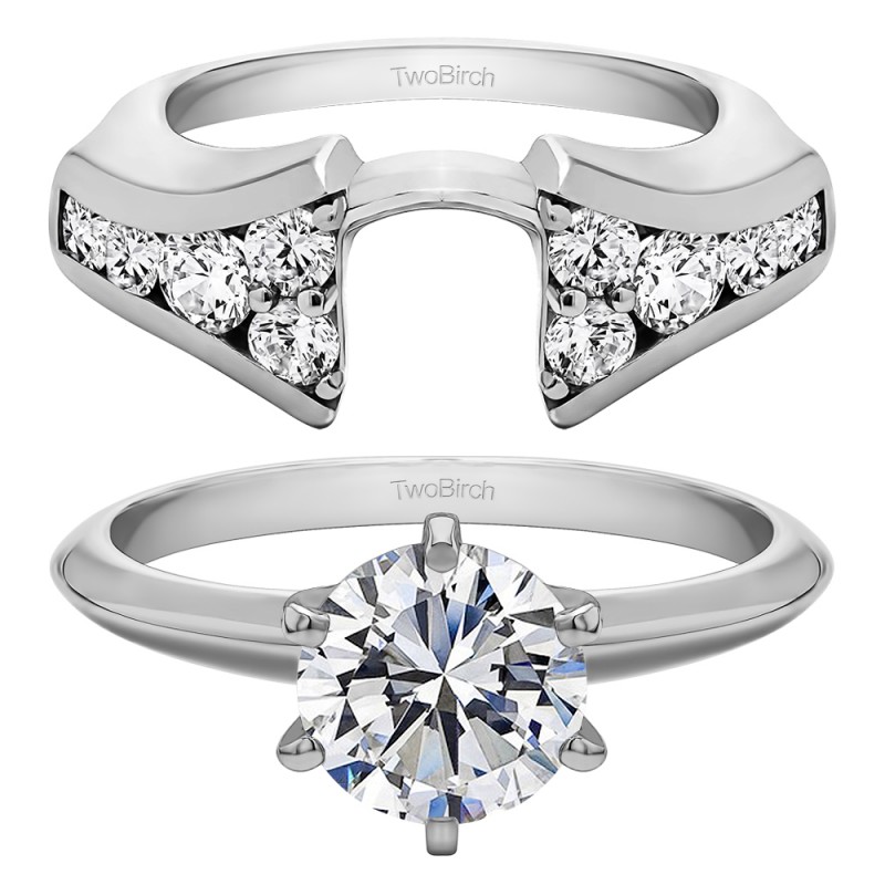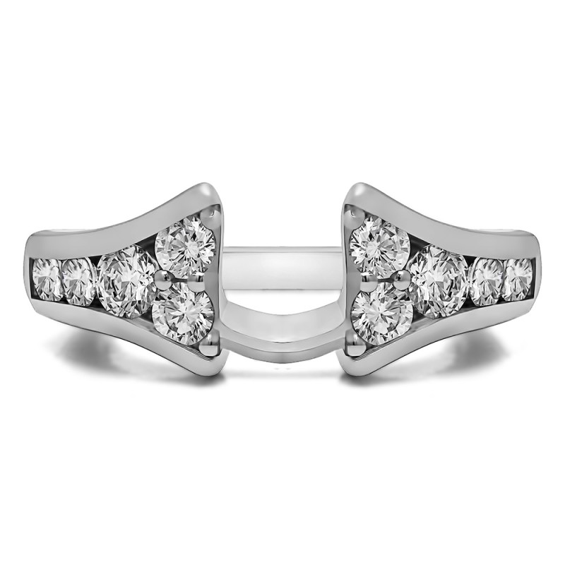 This ring wrap has 10 round, channel set stones with a total combined weight of 0.25 carats. It has a total width of 2 millimeters and has a unique Y shape with stones that lead up to the center. This ring wrap is made to fit a round solitaire from 0.75 carat up to 1.5 carat, or a marquise solitaire from 0.25 carat up to 0.5 carat, or a princess solitaire from 0.75 carat up to 1.5 carat.