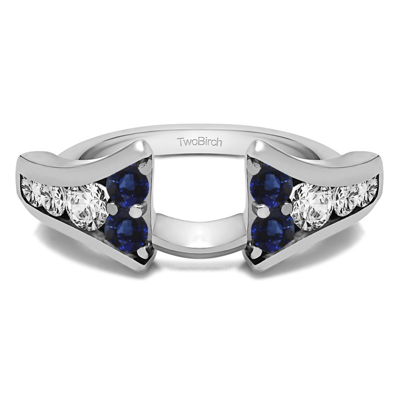 This ring wrap has 10 round, channel set stones with a total combined weight of 0.25 carats. It has a total width of 2 millimeters and has a unique Y shape with stones that lead up to the center. This ring wrap is made to fit a round solitaire from 0.75 carat up to 1.5 carat, or a marquise solitaire from 0.25 carat up to 0.5 carat, or a princess solitaire from 0.75 carat up to 1.5 carat.