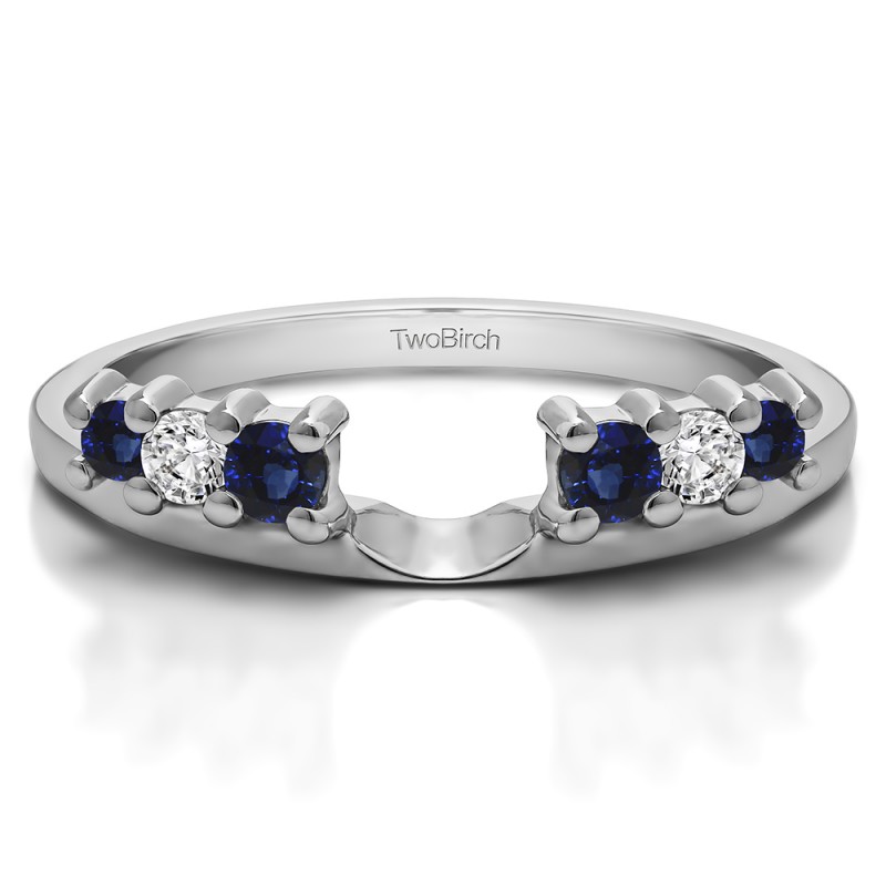 This ring wrap has 6 round, prong set stones with a total combined weight of 0.25 carats. It has a total width of 1.7 millimeters and has six stones, graduated in size. This ring wrap is made to fit a round solitaire from 0.25 carat up to 0.5 carat, or a marquise solitaire from 0.25 carat up to 0.5 carat, or a princess solitaire from 0.25 carat up to 0.5 carat.