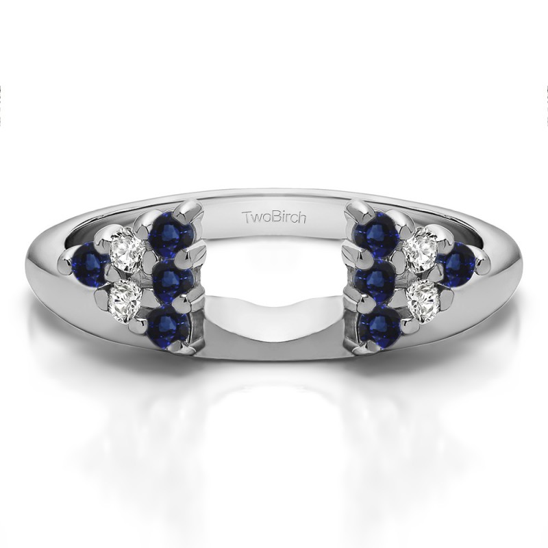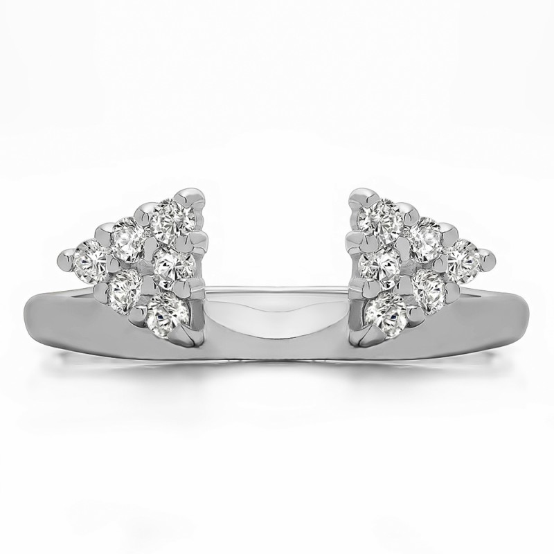 This ring wrap has 12 round, prong set stones with a total combined weight of 0.25 carats. It has a total width of 1.6 millimeters. The stones in this wrap enhance are set in two clusters, on each side of the center, making it appear as a three stone ring when added onto your solitaire. This ring wrap is made to fit a round solitaire from 0.25 carat up to 1 carat, or a marquise solitaire from 0.25 carat up to 0.5 carat, or a princess solitaire from 0.3 carat up to 1 carat.