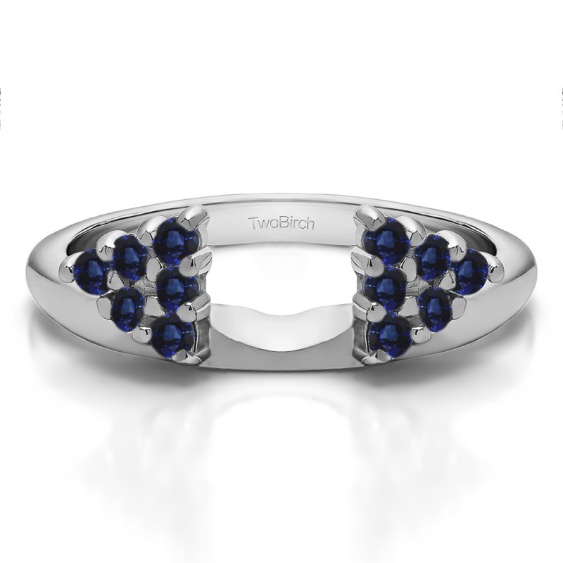 This ring wrap has 12 round, prong set stones with a total combined weight of 0.25 carats. It has a total width of 1.6 millimeters. The stones in this wrap enhance are set in two clusters, on each side of the center, making it appear as a three stone ring when added onto your solitaire. This ring wrap is made to fit a round solitaire from 0.5 carat up to 1 carat, or a marquise solitaire from 0.5 carat up to 0.75 carat, or a princess solitaire from 0.5 carat up to 1 carat.