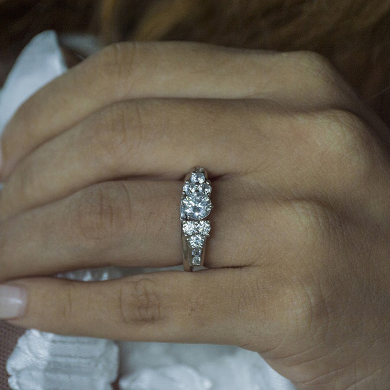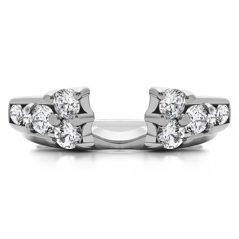 This ring wrap has 10 stones in total. It features a mix of round and round prong set stones with a total combined weight of 0.26 carats. It has a total width of 2 millimeters and has a high polish finish and a cluster of round stones. This ring wrap is made to fit a round solitaire from 0.3 carat up to 0.5 carat, or a marquise solitaire from 0.25 carat up to 0.5 carat, or a princess solitaire from 0.3 carat up to 0.5 carat.