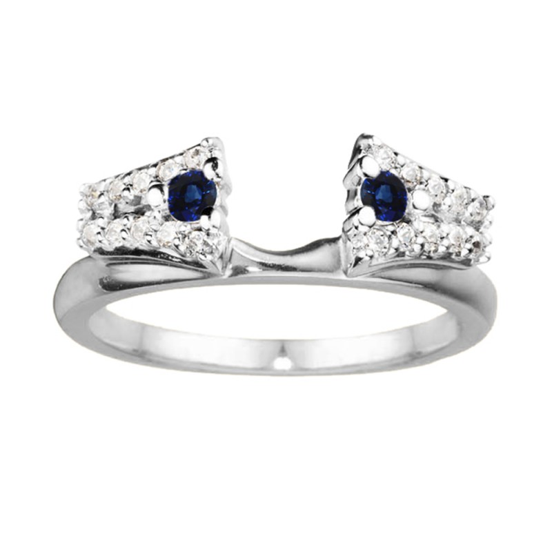 This ring wrap has 22 round, prong set stones with a total combined weight of 0.3 carats. It has a total width of 2 millimeters and has a double row of shared prong set stones with one larger one at the top, near the center. This ring wrap is made to fit a round solitaire from 0.5 carat up to 1.5 carat, or a marquise solitaire from 0.25 carat up to 0.5 carat, or a princess solitaire from 0.5 carat up to 1.5 carat.