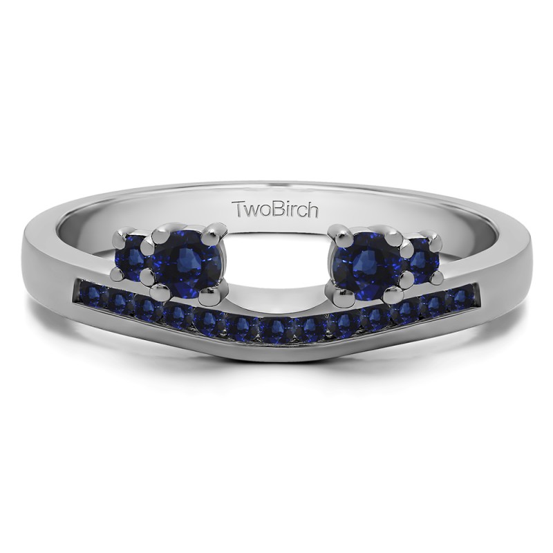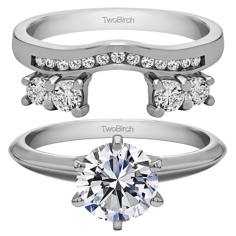 This ring wrap has 17 stones in total. It features a mix of round and round prong set stones with a total combined weight of 0.34 carats. It has a total width of 2 millimeters and features a row of round channel set stones on the band and four round prong set stones. Once you add your solitaire, it will create the look of an engagement ring with a matching channel set band. This ring wrap is made to fit a round solitaire from 0.3 carat up to 2 carat, or a marquise solitaire from 0.25 carat up to 0.5 carat, or a princess solitaire from 0.25 carat up to 0.5 carat.