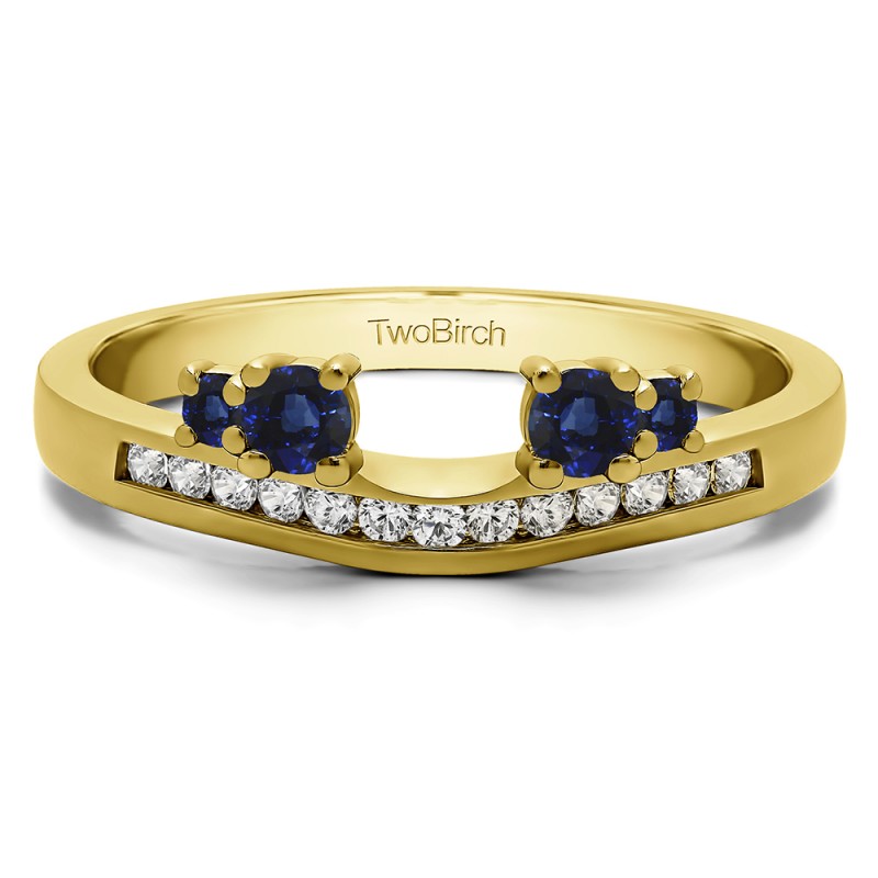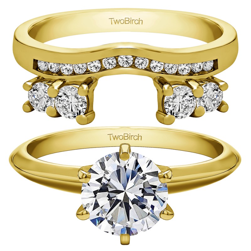This ring wrap has 17 stones in total. It features a mix of round and round prong set stones with a total combined weight of 0.34 carats. It has a total width of 2 millimeters and features a row of round channel set stones on the band and four round prong set stones. Once you add your solitaire, it will create the look of an engagement ring with a matching channel set band. This ring wrap is made to fit a round solitaire from 0.3 carat up to 2 carat, or a marquise solitaire from 0.25 carat up to 0.5 carat, or a princess solitaire from 0.25 carat up to 0.5 carat.