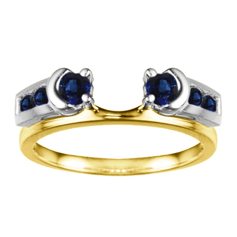 This ring wrap has 6 stones in total. It features a mix of round and round prong set stones with a total combined weight of 0.48 carats. It has a total width of 2 millimeters. Round stones are set in a unique half bezel, giving the ring wrap the appearance of a half-moon on each side of the center. This ring wrap is made to fit a round solitaire from 0.5 carat up to 0.75 carat, or a marquise solitaire from 0.25 carat up to 0.5 carat, or a princess solitaire from 0.5 carat up to 0.75 carat.