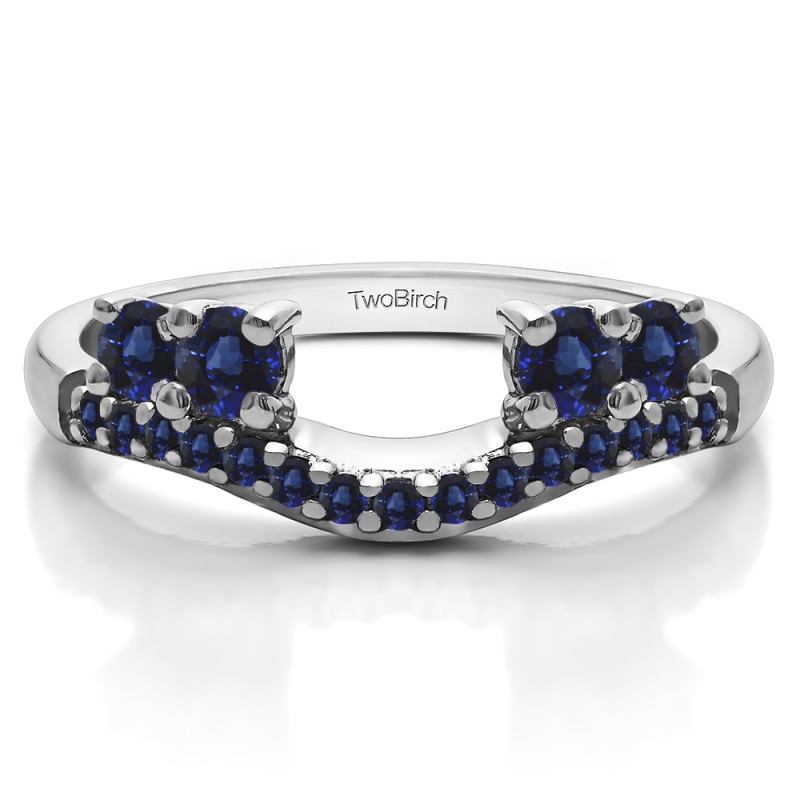 This ring wrap has 19 round, prong set stones with a total combined weight of 0.49 carats. It has a total width of 2 millimeters and features a contoured band with shared progs and four graduated stones, prong set. When combined with a solitaire, it created a perfectly matched bridal set consisting of curved ring and engagement ring. This ring wrap is made to fit a round solitaire from 0.5 carat up to 2 carat, or a marquise solitaire from 0.25 carat up to 0.5 carat, or a princess solitaire from 0.5 carat up to 1 carat.