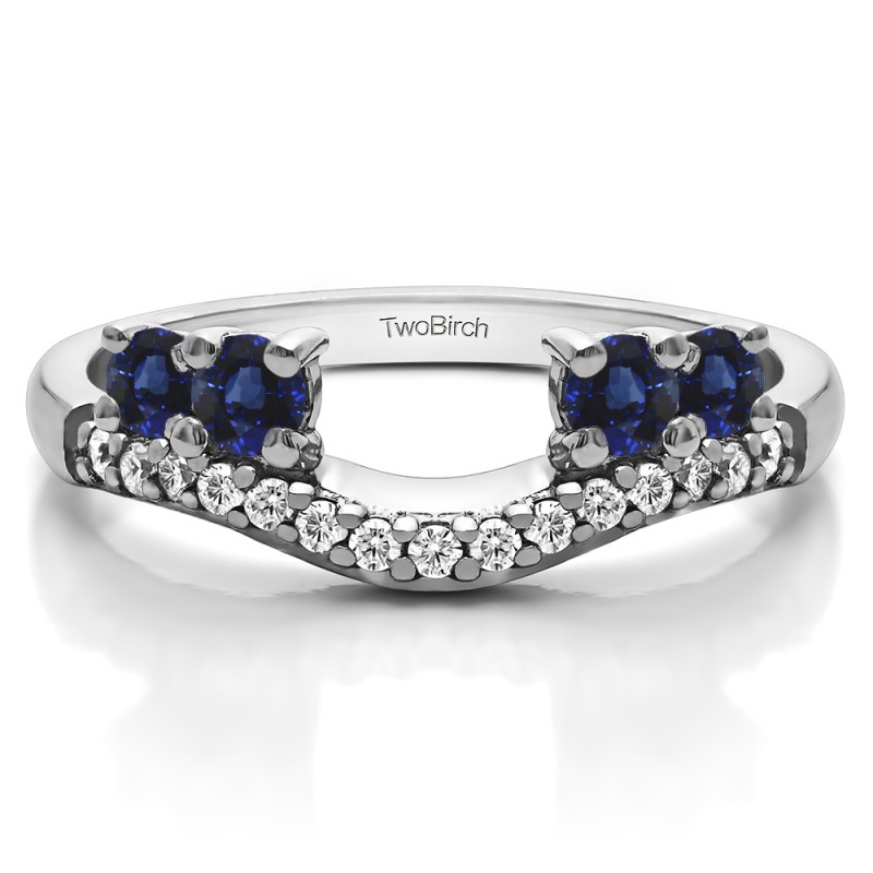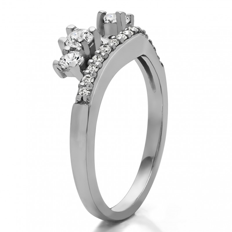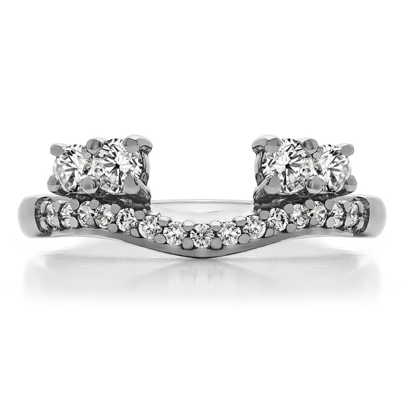 This ring wrap has 19 round, prong set stones with a total combined weight of 0.49 carats. It has a total width of 2 millimeters and features a contoured band with shared progs and four graduated stones, prong set. When combined with a solitaire, it created a perfectly matched bridal set consisting of curved ring and engagement ring. This ring wrap is made to fit a round solitaire from 0.5 carat up to 2 carat, or a marquise solitaire from 0.25 carat up to 0.5 carat, or a princess solitaire from 0.5 carat up to 1 carat.