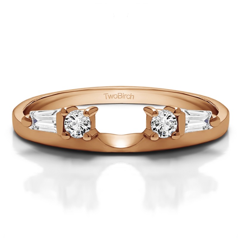 This ring wrap has 4 stones in total. It features a mix of round and baguette prong set stones with a total combined weight of 0.25 carats. It has a total width of 2 millimeters and features a classic high polish finish. This ring wrap is made to fit a round solitaire from 0.25 carat up to 1 carat, or a marquise solitaire from 0.25 carat up to 0.5 carat, or a princess solitaire from 0.25 carat up to 1 carat.
