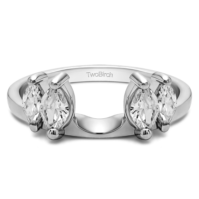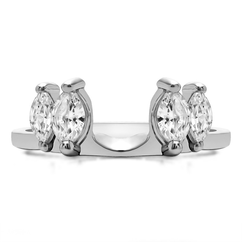 This ring wrap has 4 marquise, prong set stones with a total combined weight of 0.32 carats. It has a total width of 1.8 millimeters. The marquise stones in this wrap are graduated in size. This ring wrap is made to fit a round solitaire from 0.25 carat up to 1 carat, or a marquise solitaire from 0.25 carat up to 0.5 carat, or a princess solitaire from 0.3 carat up to 1 carat.