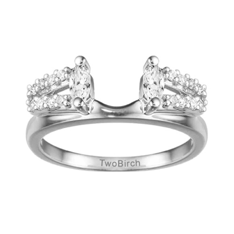 This ring wrap has 18 stones in total. It features a mix of round and marquise prong set stones with a total combined weight of 0.41 carats. It has a total width of 2 millimeters and has a double row of stones with a marquise stone on the top. This ring wrap is made to fit a round solitaire from 0.5 carat up to 2 carat, or a marquise solitaire from 0.25 carat up to 0.5 carat, or a princess solitaire from 0.75 carat up to 1 carat.