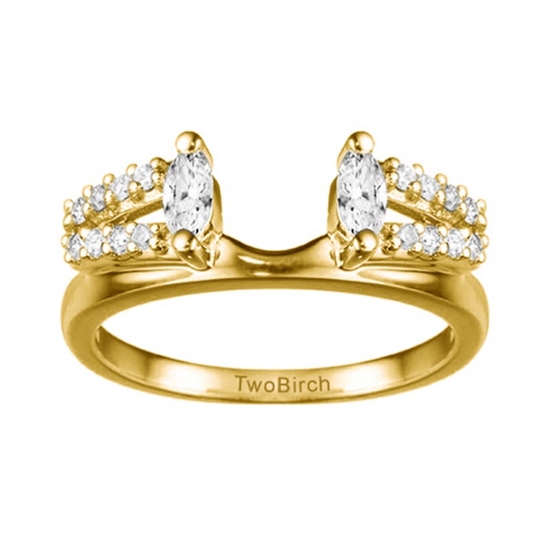 This ring wrap has 18 stones in total. It features a mix of round and marquise prong set stones with a total combined weight of 0.41 carats. It has a total width of 2 millimeters and has a double row of stones with a marquise stone on the top. This ring wrap is made to fit a round solitaire from 0.5 carat up to 2 carat, or a marquise solitaire from 0.25 carat up to 0.5 carat, or a princess solitaire from 0.75 carat up to 1 carat.
