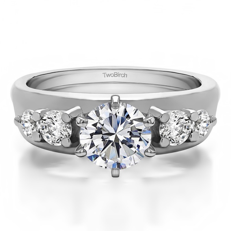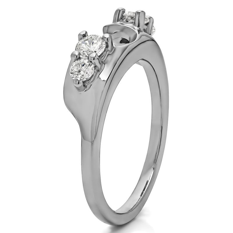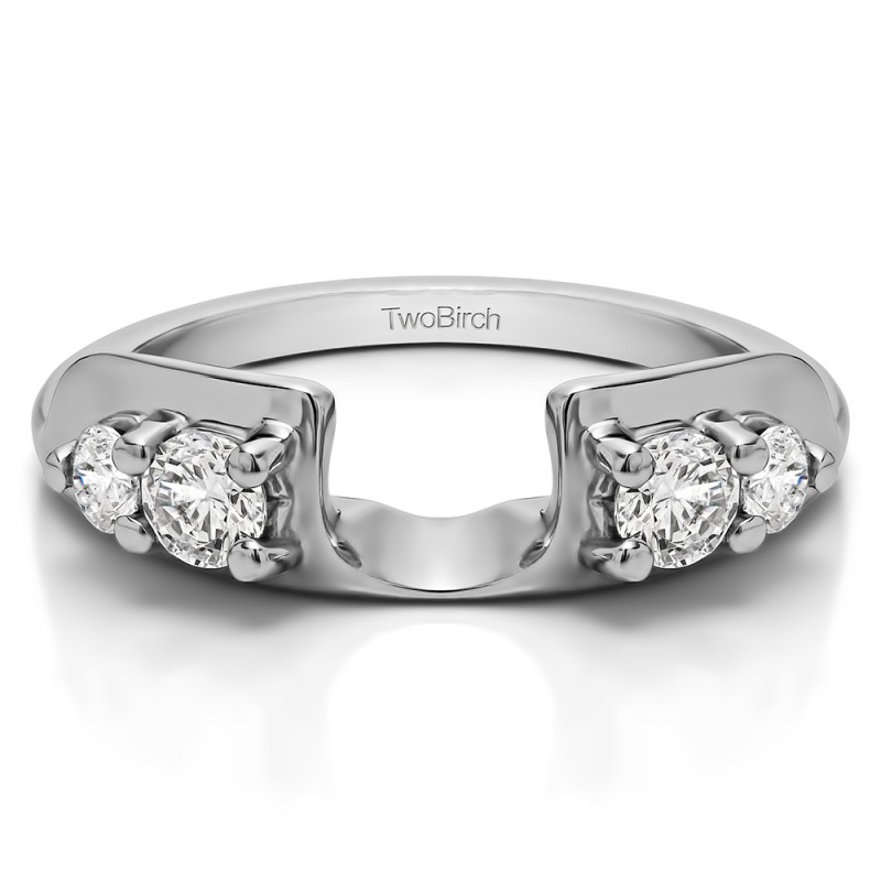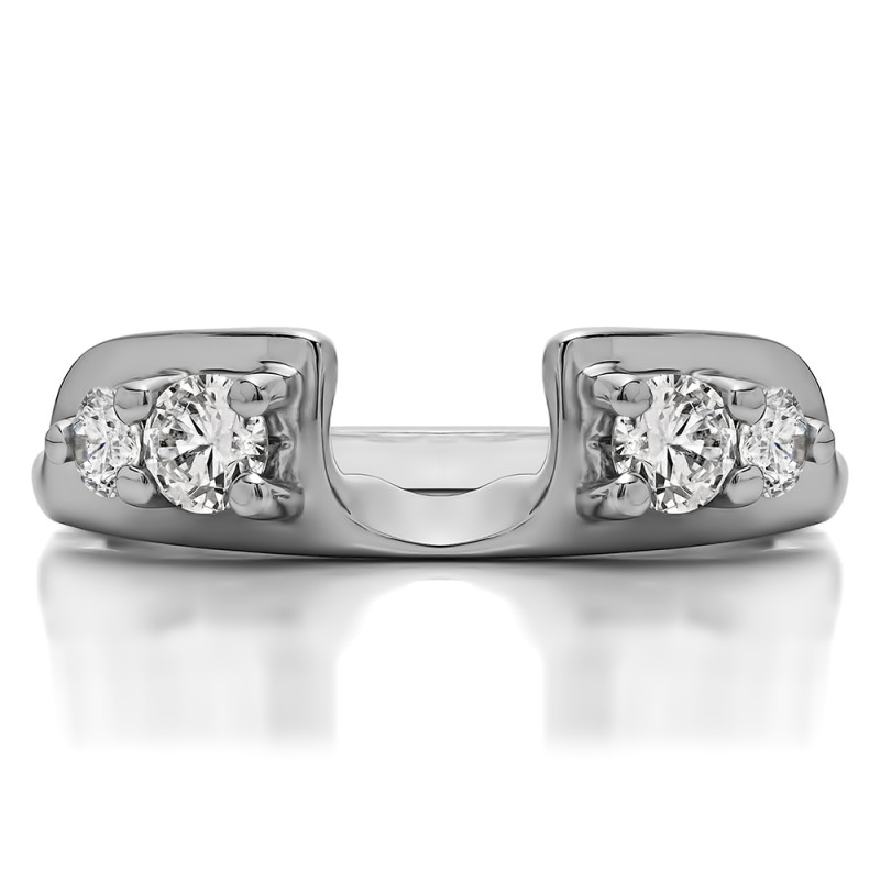 This ring wrap has 4 round, prong set stones with a total combined weight of 0.48 carats. It has a total width of 2 millimeters. The stones in the ring wrap jacket are graduated in size. This ring wrap is made to fit a round solitaire from 0.5 carat up to 1 carat, or a marquise solitaire from 0.25 carat up to 0.5 carat, or a princess solitaire from 0.75 carat up to 1 carat.
