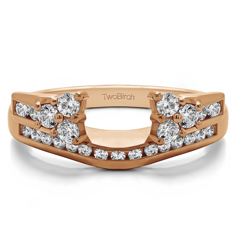 This ring wrap has 25 stones in total. It features a mix of round and round prong set stones with a total combined weight of 0.5 carats. It has a total width of 2 millimeters and features a channel set row of stones on the band, with a cluster of round stones surrounding the center stone, once you add your solitaire. This ring wrap is made to fit a round solitaire from 0.75 carat up to 1.5 carat, or a marquise solitaire from 0.25 carat up to 0.5 carat, or a princess solitaire from 0.25 carat up to 0.5 carat.