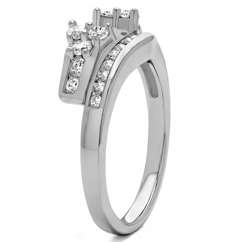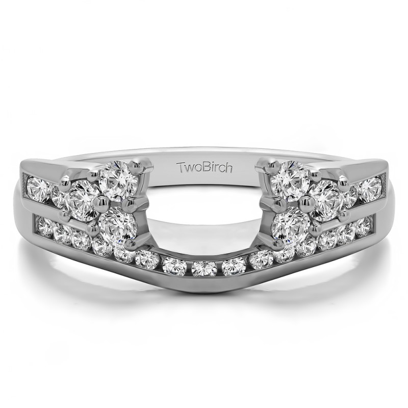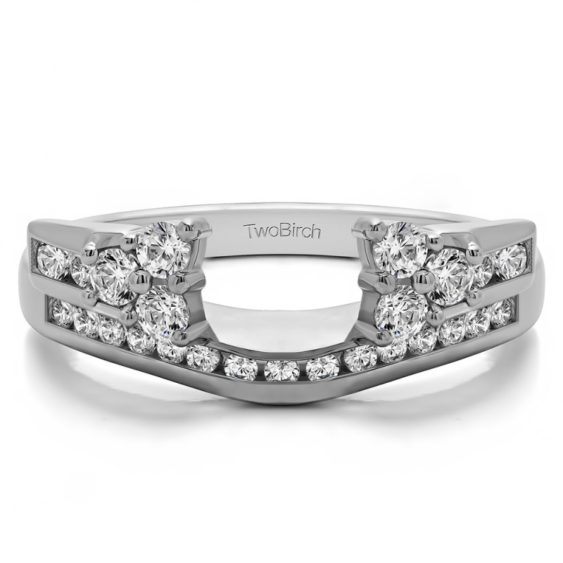 This ring wrap has 25 stones in total. It features a mix of round and round prong set stones with a total combined weight of 0.5 carats. It has a total width of 2 millimeters and features a channel set row of stones on the band, with a cluster of round stones surrounding the center stone, once you add your solitaire. This ring wrap is made to fit a round solitaire from 0.75 carat up to 1.5 carat, or a marquise solitaire from 0.25 carat up to 0.5 carat, or a princess solitaire from 0.25 carat up to 0.5 carat.