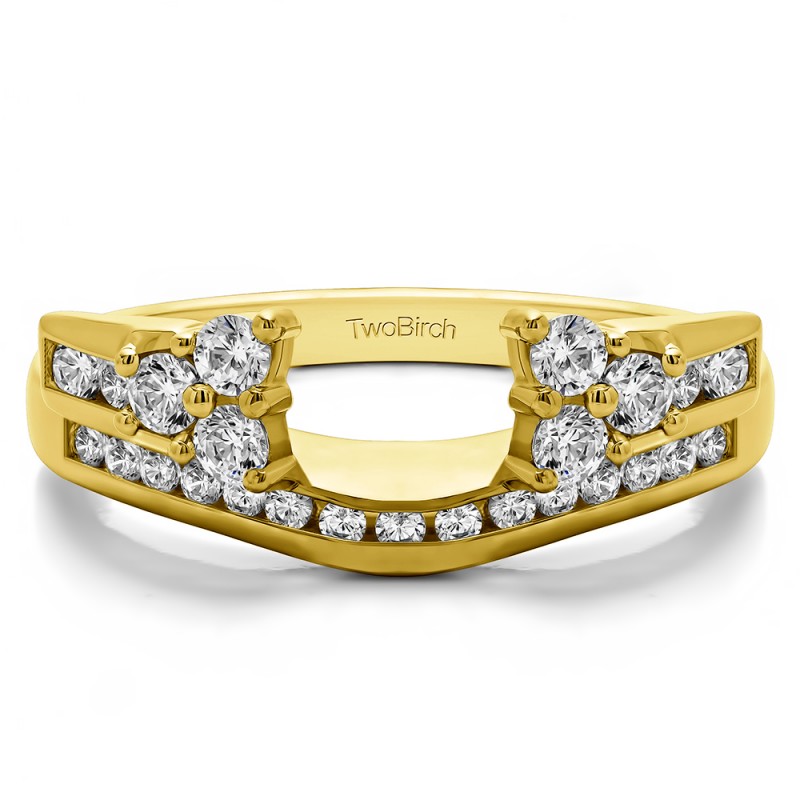 This ring wrap has 25 stones in total. It features a mix of round and round prong set stones with a total combined weight of 0.5 carats. It has a total width of 2 millimeters and features a channel set row of stones on the band, with a cluster of round stones surrounding the center stone, once you add your solitaire. This ring wrap is made to fit a round solitaire from 0.75 carat up to 1.5 carat, or a marquise solitaire from 0.25 carat up to 0.5 carat, or a princess solitaire from 0.25 carat up to 0.5 carat.
