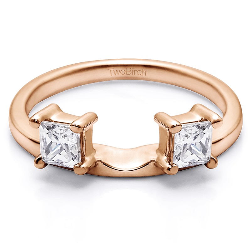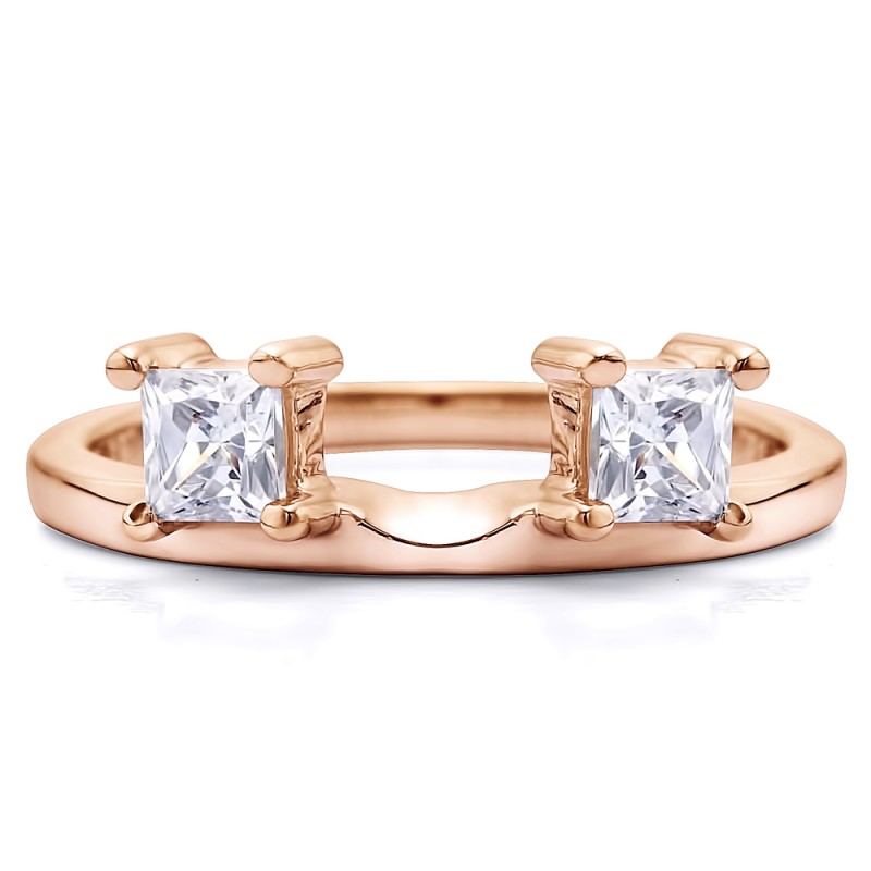 This ring wrap has 2 Princess, prong set stones with a total combined weight of 0.5 carats. It has a total width of 2 millimeters. Since this ring wrap has one stone each side of the center, it will create a three stone ring look once you place your solitaire in the center. This ring wrap is made to fit a round solitaire from 0.75 carat up to 1 carat, or a marquise solitaire from 0.25 carat up to 0.5 carat, or a princess solitaire from 0.5 carat up to 1 carat.