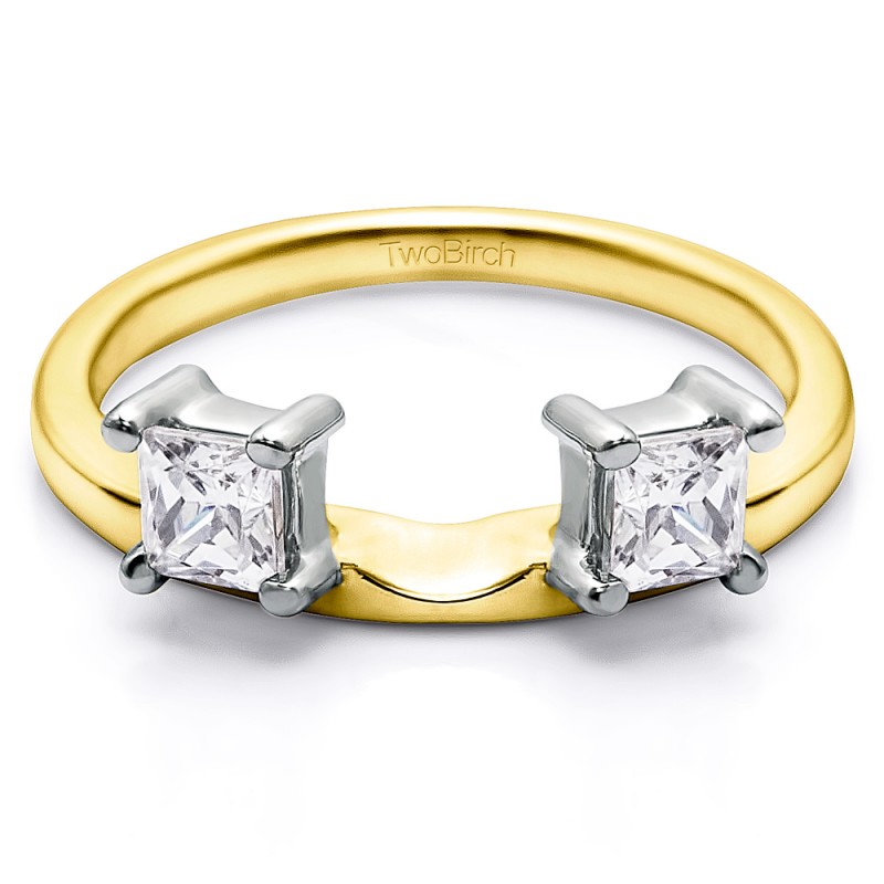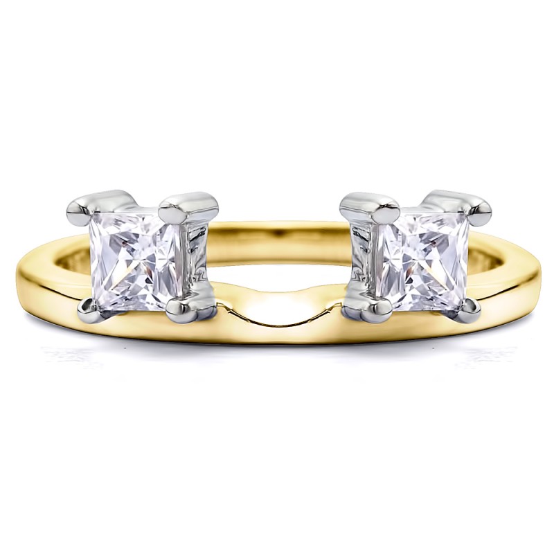 This ring wrap has 2 Princess, prong set stones with a total combined weight of 0.5 carats. It has a total width of 2 millimeters. Since this ring wrap has one stone each side of the center, it will create a three stone ring look once you place your solitaire in the center. This ring wrap is made to fit a round solitaire from 0.75 carat up to 1 carat, or a marquise solitaire from 0.25 carat up to 0.5 carat, or a princess solitaire from 0.5 carat up to 1 carat.