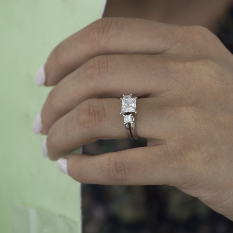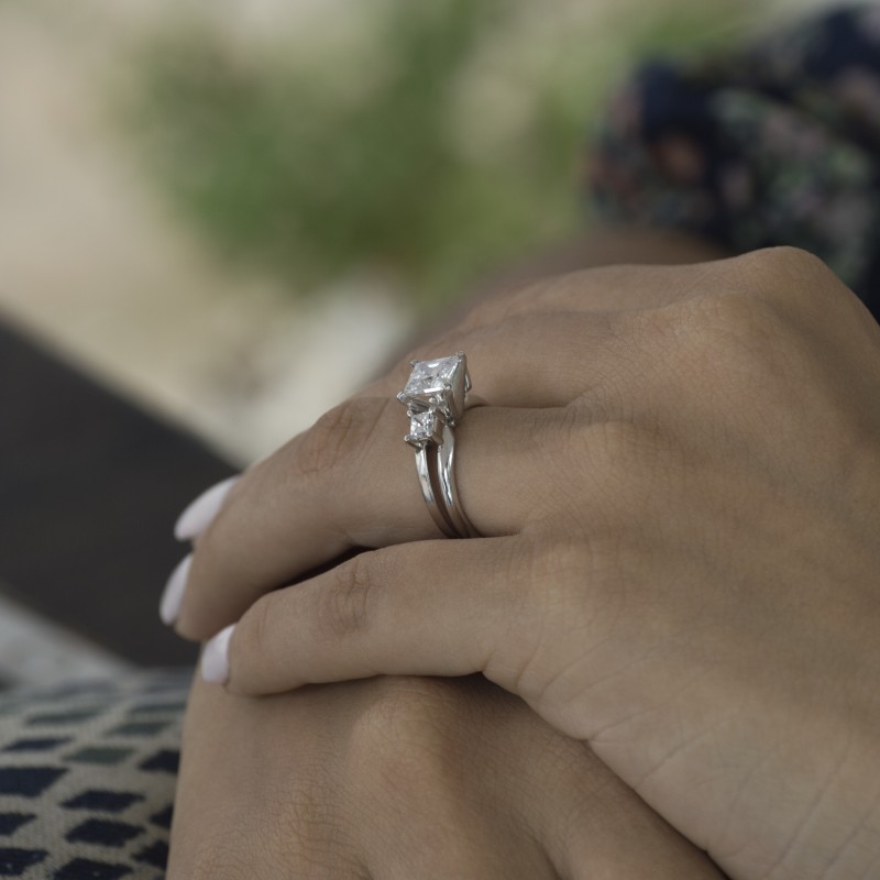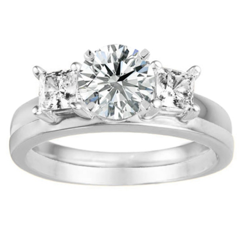 This ring wrap has 2 Princess, prong set stones with a total combined weight of 0.5 carats. It has a total width of 2 millimeters. Since this ring wrap has one stone each side of the center, it will create a three stone ring look once you place your solitaire in the center. This ring wrap is made to fit a round solitaire from 0.75 carat up to 1 carat, or a marquise solitaire from 0.25 carat up to 0.5 carat, or a princess solitaire from 0.5 carat up to 1 carat.