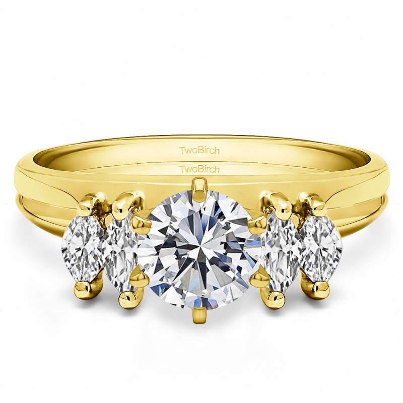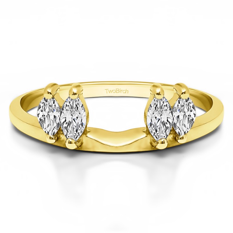 This ring wrap has 4 marquise, prong set stones with a total combined weight of 0.5 carats. It has a total width of 2 millimeters. The four stones in this ring wrap are graduated in size. This ring wrap is made to fit a round solitaire from 0.25 carat up to 1 carat, or a marquise solitaire from 0.25 carat up to 0.5 carat, or a princess solitaire from 0.3 carat up to 1 carat.