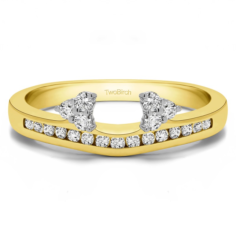 This ring wrap has 21 stones in total. It features a mix of round and round prong set stones with a total combined weight of 0.51 carats. It has a total width of 2 millimeters. It on this anniversary wrap is contoured and channel set with round stones. It also features prong set clusters of round stones with a high polish finish. This ring wrap is made to fit a round solitaire from 1 carat up to 2 carat, or a marquise solitaire from 0.25 carat up to 0.5 carat, or a princess solitaire from 0.75 carat up to 1.5 carat.